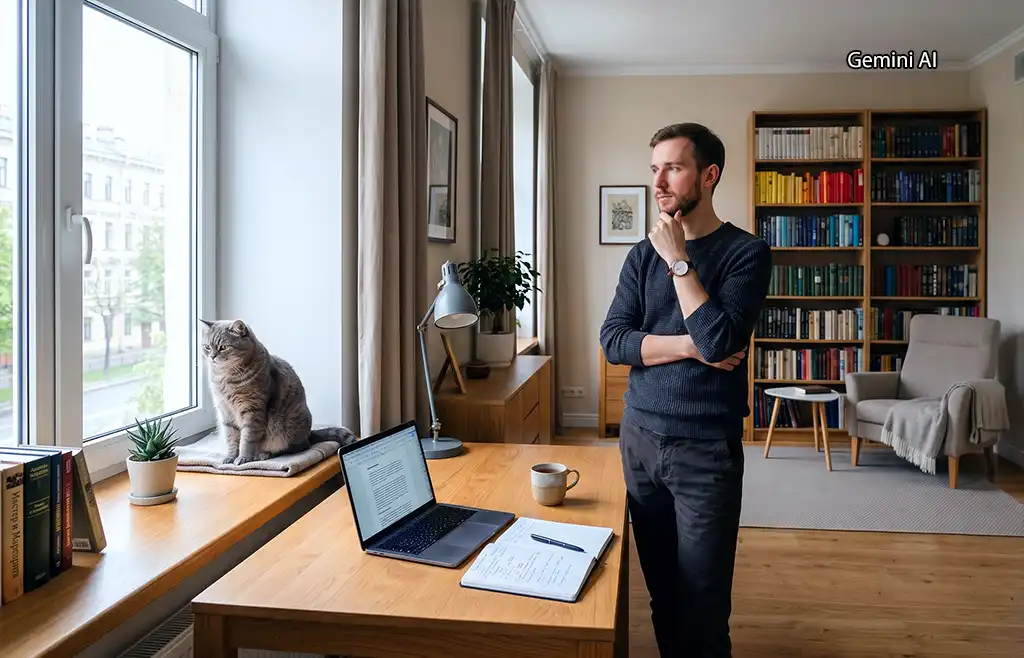 Хозяин кота, Алекс, работал корректором в типографии. Он верил, что мир - это верстка. Если где-то вылезла "висячая строка" или опечатка, ее нужно исправить красной ручкой. Его жизнь - это триумф порядка: носки разложены по спектру, а кот приучен мяукать строго в тональности соль-мажор.